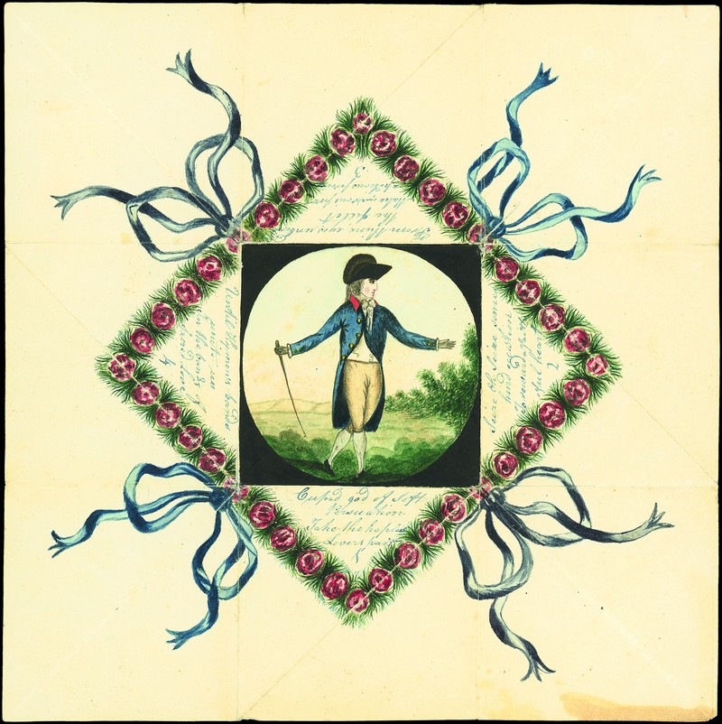 1795 Valentine, opening to reveal a handpainted portrait of a young man in the centre panel, surrounded by flowers, lovers knots and a message; fine and rare. Photo