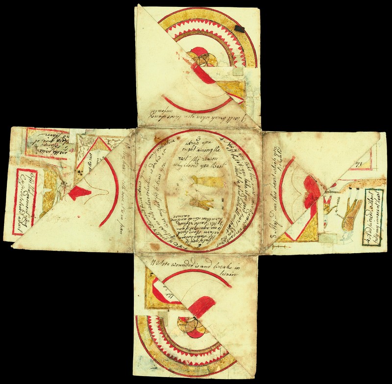 1795 (c.) hand written and illustrated with hand painted Pastoral scenes, geometiric and military designs, of note are the central panel with a soldier guarding the house and a three masted vessel with Union Jacks, red ensign and an intricate lover's know. Superb and rare. Photo