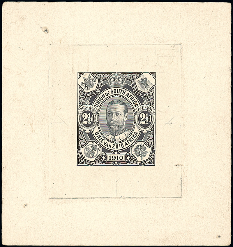 Die Proof in black on proof paper (72x73mm), with faint guide lines, pencil notation on the reverse, "s/s16985 2 plates today 7o/c Grohere"; pin holes in three corners; fine. Photo