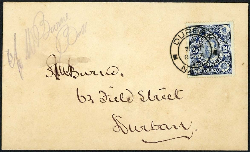 1910 (4 Nov.) local Durban envelope bearing 2½d. tied by an upright first day cancellation; a few minor age marks but still good to fine