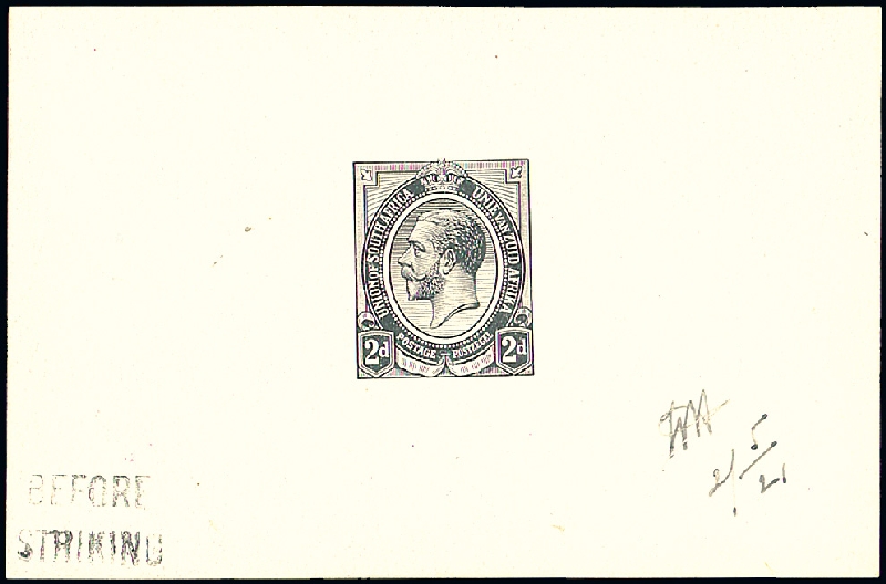 2d. die proof in black on glazed card (82x60mm) marked "before/striking", initialled and dated "WA 2/5/21"; slight buckling at left, otherwise fresh and fine. Photo
