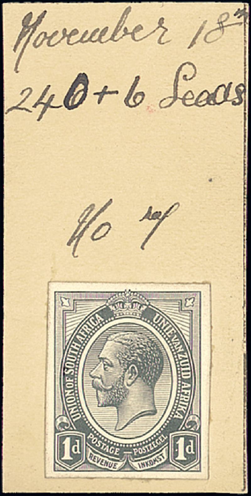 1d. stamp-size die proof from the day book, with notation, "November 18, 240+6 Leads, No.7"; fine. Photo