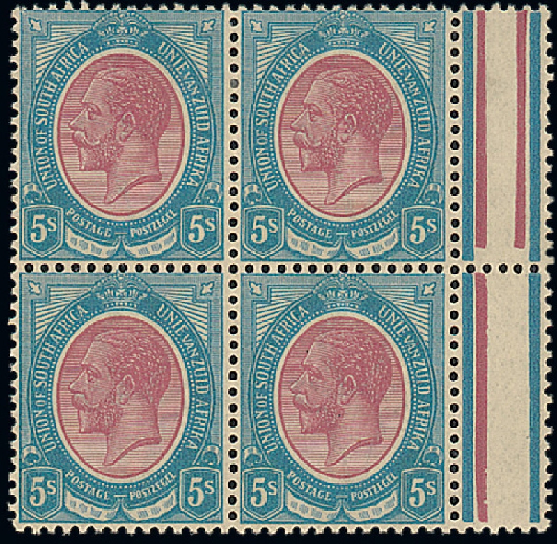 5/- purple and blue in a block of four with interpanneau margin at right showing missing jubilee line, large part original gum. Photo