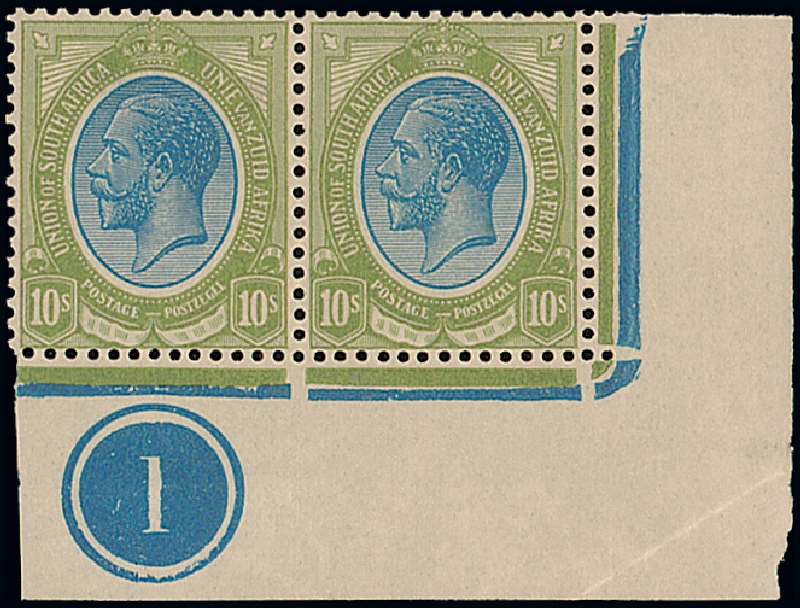 10/- blue and olive-green in a lower right corner pair showing the plate number "1", large part original gum; small faults in the margin corner. Photo