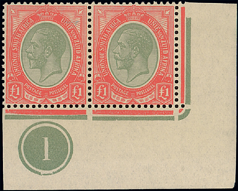 £1 pale olive-green and red in a lower plate "1" corner pair, lightly mounted in the margin only. Fresh and fine. Photo