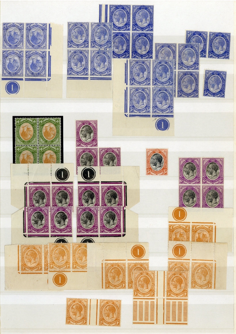 A selection on stock leaves which features numerous corner plate blocks including ½d. plate "5" corner blocks of six (2) with inverted watermark and others with inverted watermark, 3d. corner block with inverted watermark, and others with values to 1/-, also vals. to 5/-; a group of 1910 2½d. in multiples