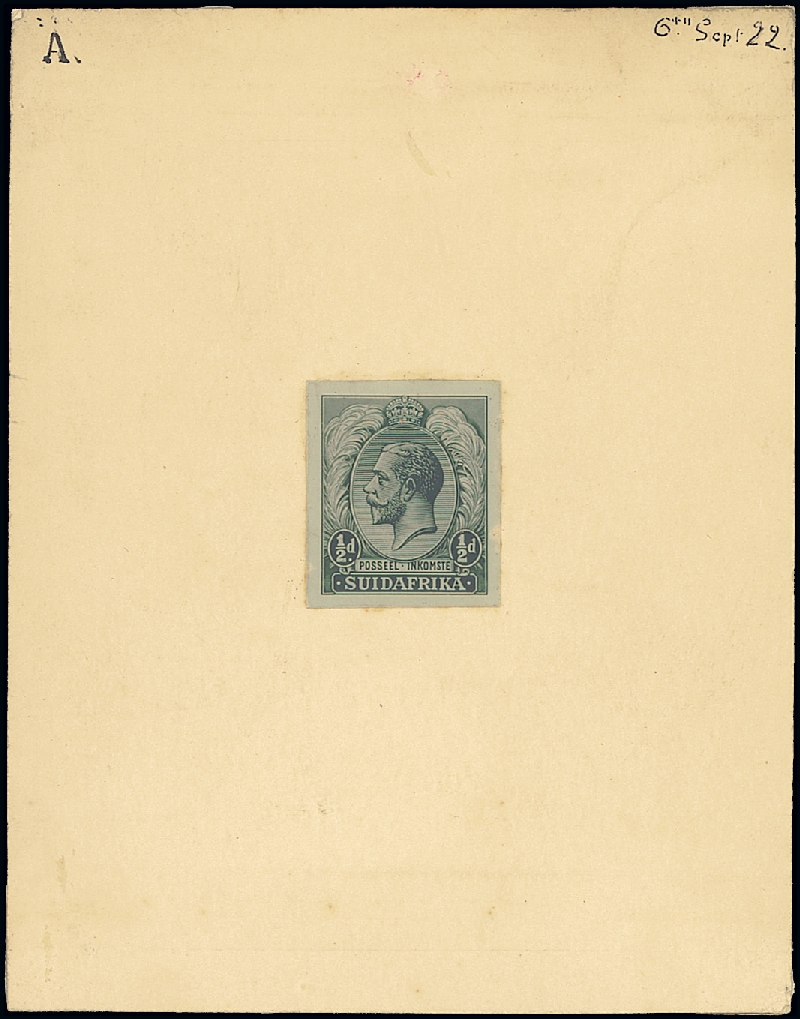 A: ½d. photographic essay in deep green on bluish featuring K.G.V head on background of ostrich feathers, legend reads "posseel inkomste" and "suidafrika", mounted in card (90x113mm), dated "6th Sept 22". Fine and rare. Photo