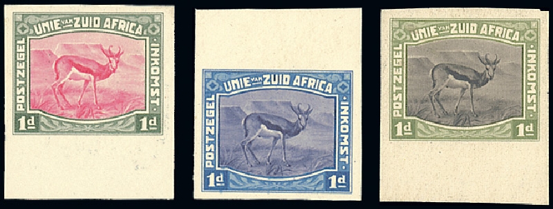1d. Springbok essay; a selection on leaves with unscreened imperforate colours (3), screen imperforate in two colours (5), perforated in two colours (3) and single colours in two blocks of four; generally fresh and fine. (25). Photo