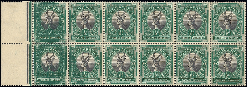 ½d. black and green variety frame printed double in a left margin block of twelve, mounted on top right pair and margin only; the doubling is complete on one stamp, virtually complete on a second and partial on one other. A stunning and highly important multiple; probably the rarest error in South African philately. S.G. 30d. Photo