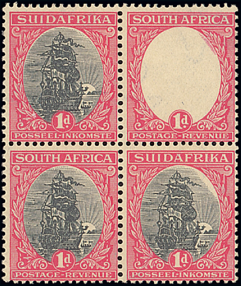 1d. black and carmine variety black omitted, a single stamp in a block of four, large part original gum. There is a trace of an offset of the red jubilee line on the face of the black-missing stamp and a fraction of the vignette of the stamp below missing. A good block. Photo