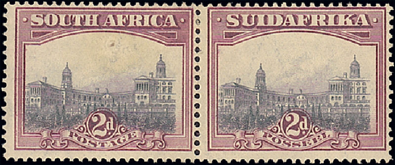 2d. grey and purple, perf.14 variety inverted watermark in a horizontal pair, large part original gum; folded between pair. S.G. 34aw, £750. Photo
