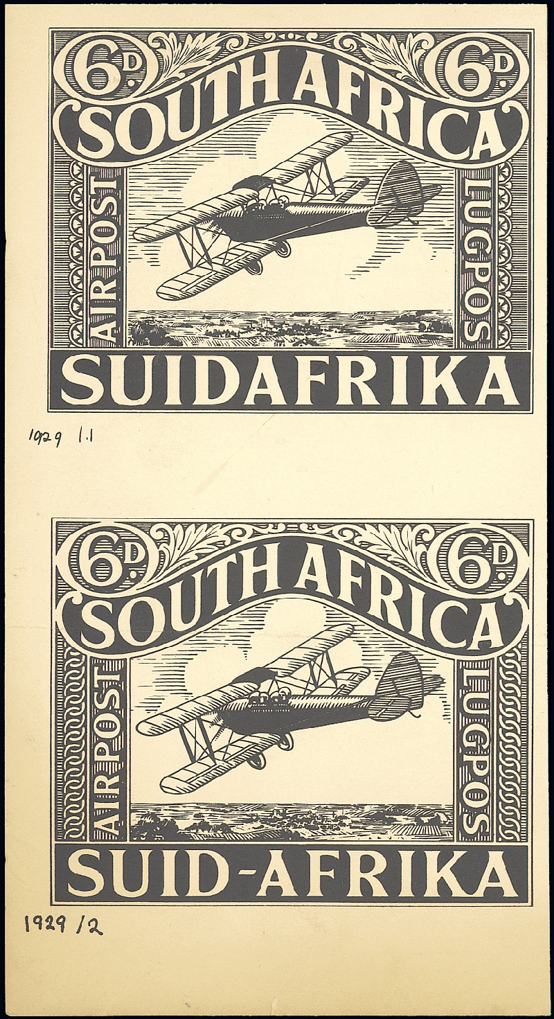 Two slightly different essays for a 6d. value in black on stout, surfaced paper, each measuring 103x82mm, small differences in the background ornamentation as well as the landscape and numbered in black ink, "1929 /1" and "1929 /2"; two horizontal folding creases and some light staining at foot. Rare and desirable. Photo