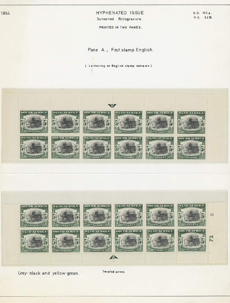 5/- grey-black and deep yellow-green, upper and lower sheet blocks of twelve, pane A with cylinders "72" and "8", lightly mounted mint. S.G. 122a, £600