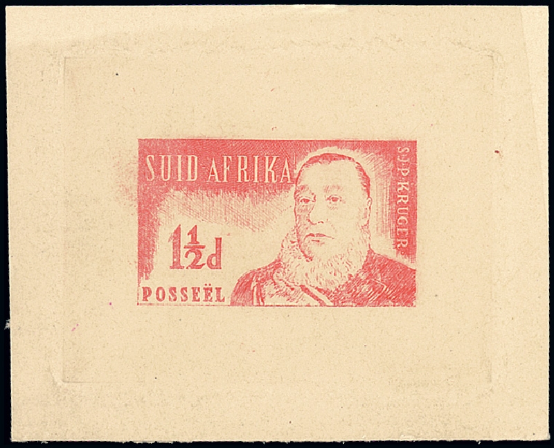 1½d. Paul Kruger, first proof, a die proof in scarlet-vermilion on soft card (70x56mm), fine. Photo