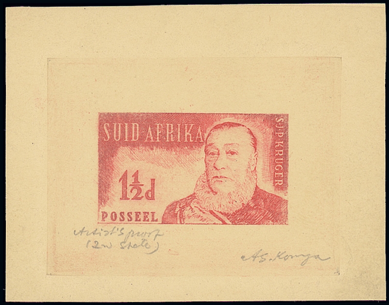 1½d. Paul Kruger, second proof, a die proof in brownish red on soft card (72x57mm) with pencil inscription, "Artists proof (2nd state) A.S. Konya", fine. Photo