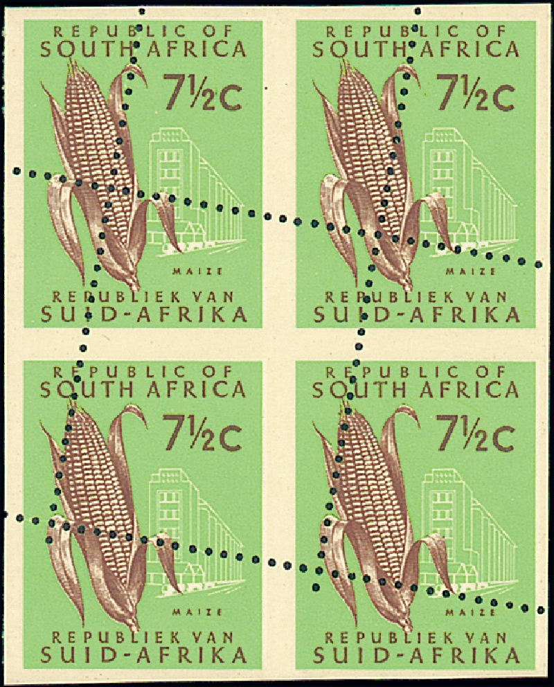 7½c. Maize misplaced perforations in a block of four with the perforations at an angle and well misplaced, unmounted mint, the perforations being from the foot of the sheet. Photo