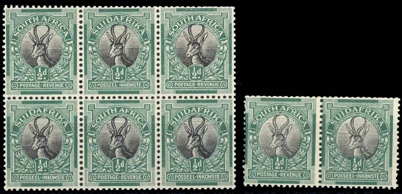 ½d. black and green, perf.13½x14 in a pane of six (without margin) plus a pair with pale vignette, large part original gum to unmounted mint; fair to good perfs.