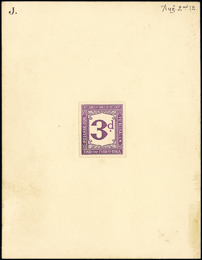 De La Rue photographic essay of 3d. value in mauve, stamp size and mounted on card lettered "J." and dated "Aug 2nd 12", on the reverse written "Vol 2/54" and "Appd 25 9/12". Fine. Photo