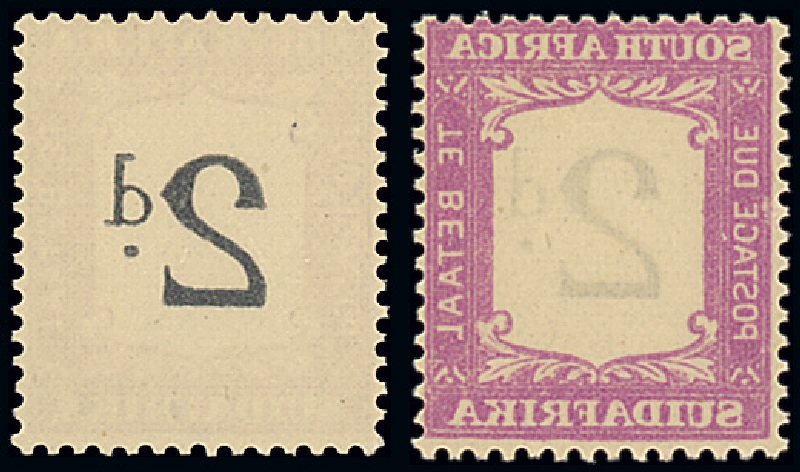 2d. black and violet, two examples showing completed off-set of frame and of value, one is lightly mounted on the face. Unusual. Photo