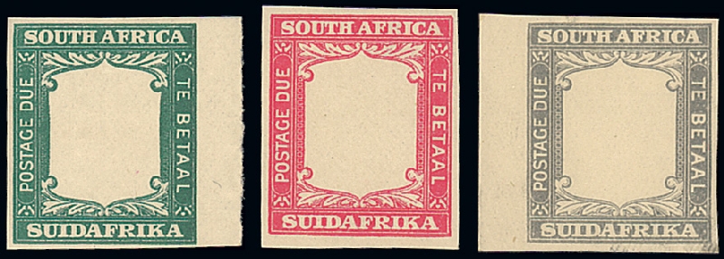 Imperforate frame plate proofs in green, in carmine and in slate (½d., 1d. and 6d.) on gummed paper, large part original gum. Photo