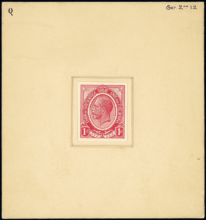 1913 1d. cut down die proof in carmine-brown, sunk mounted on card marked "Q" and dated "Oct 2nd 12", fine. Photo