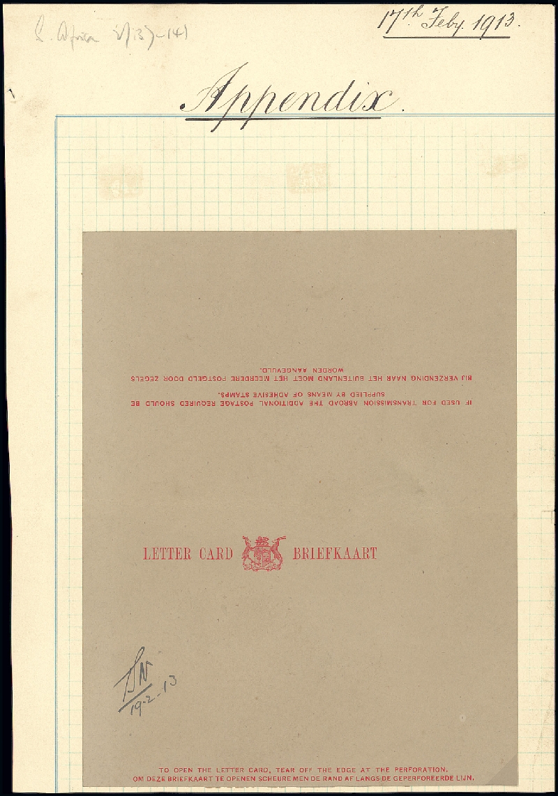 1913 1d., imperforate proof without value, in red on grey and affixed to piece of "Appendix" sheet dated "17th Feby 1913", the card is initialled and dated "19.2.13" in ink. Photo