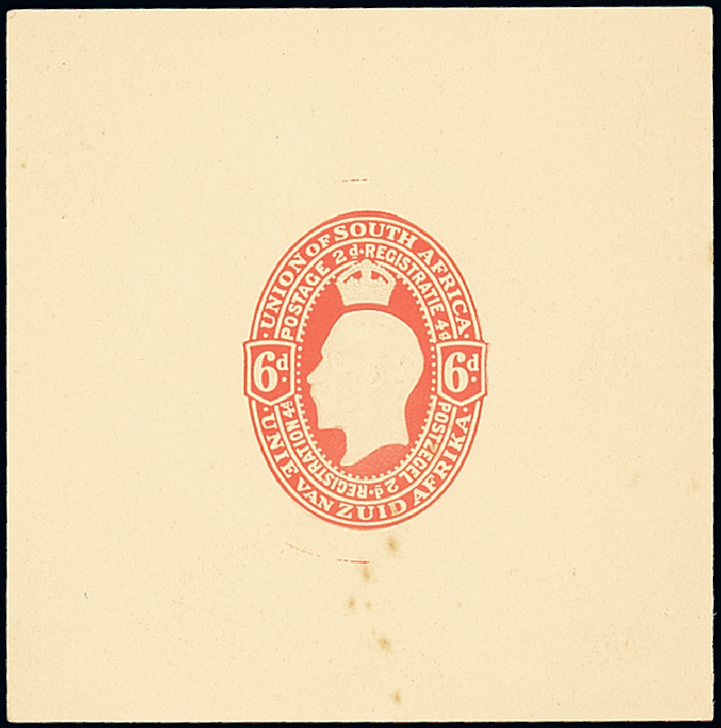 1922 6d. embossed die proof in vermilion on stout, wove paper with part papermaker's watermark (62x62mm); a few faint tone spots, otherwise fine. Photo