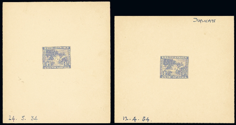 1934-45 die proofs of the accepted design in grey-blue mounted on card. The first with Afrikaans at top is dated "24.3.34" the second, with English at top, is marked "duplicate" and dated "12.4.34", both with De la Rue oval handstamp on reverse. The first card with light corner bend, otherwise fine. Photo