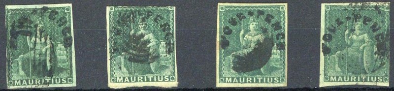 4d. green, four used examples, one with four margins the others touched or cut-into on one side, all with small faults though generally sound. S.G. 26, £1800