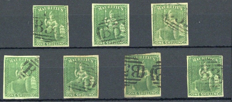 1/- yellow-green, seven used examples, all with four margins and all cancelled "B53", condition good to fine. S.G. 35, £1050