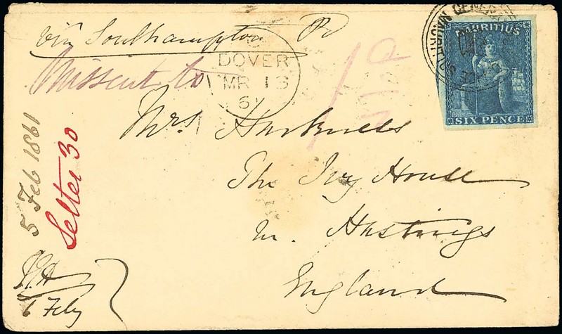 1861 (6 Feb.) envelope ex the "Harkness" correspondence to Hastings, marked "via Southampton Pd", bearing 1859 imperf 6d. blue with large margins neatly tied by "general post office/Crown/mauritius" circular h.s. (Type K4; earliest recorded date), showing red ink "1½d" alongside, Dover c.d.s. with manuscript "Missent to" in violet ink alongside and, on reverse, G.P.O. Mauritius double-ring d.s. and arrival c.d.s. A rare and attractive franking. Photo
