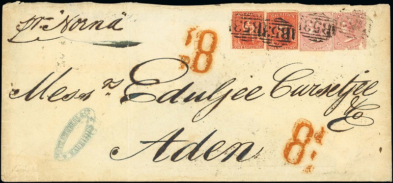 1862 (6 Jan.) envelope (228x104mm.) quadruple rate envelope ex "Cursetjee" correspondence to Aden, marked "pr Norna", bearing 1/- vermilion horizontal pair with clear to large margins, in combination with 1864 4d. rose (2, one with surface damage at lower right), all cancelled "B53", showing two strikes of red "8d" accountancy h.s. with, on reverse, despatch and Aden Steamer Point (20.1) datestamps. A fine franking. S.G. 34, 48. Photo