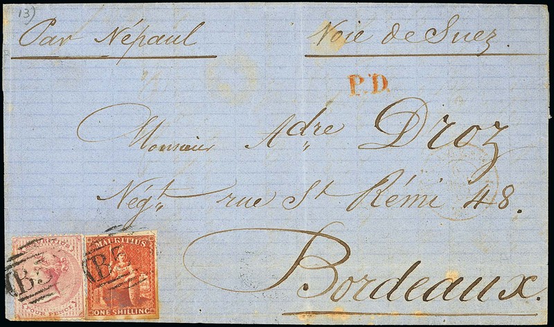 1862 (5 Feb.) entire to Bordeaux, marked "Par Nepaul" and "Voie de Suez", bearing 1/- vermilion in combination with 1860 4d. carmine, both tied by "B53" obliterator, showing red unframed "p.d." and Marseilles entry d.s. with, on reverse, despatch and arrival datestamps; both stamps with stains and crossed by horizontal filing crease. R.P.S. Certificate (2013) states "the 1s stamp did not originate on this lettersheet", a view with which we do not concur. S.G. 34,48. Photo