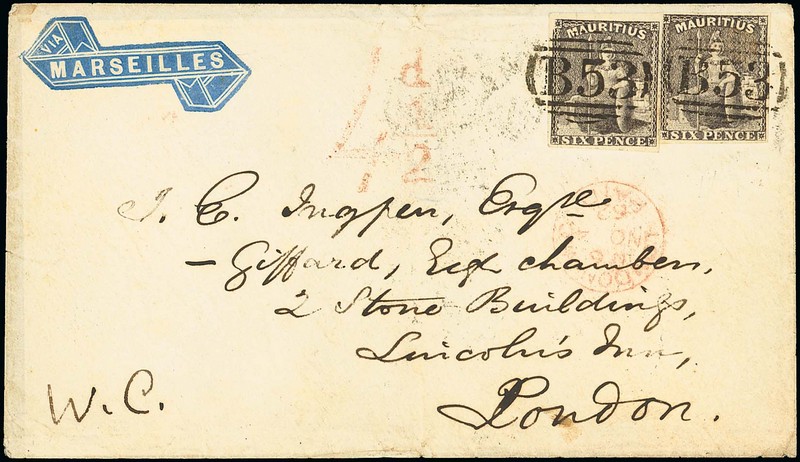1862 (6 Oct.) envelope to London with embossed "via marseilles" at upper left, bearing 6d. dull purple-slate (2, both with four margins) clearly tied by "B53" obliterator, showing red "4½d" accountancy h.s. and arrival c.d.s. alongside with blue despatch datestamp on reverse. A rare stamp on cover. R.P.S. Certificate (1980). S.G. 33. Photo