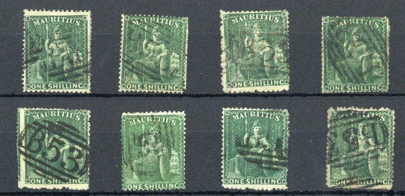 1/- deep green, eight used examples, all cancelled "B53", good to fine. S.G. 55, £2600