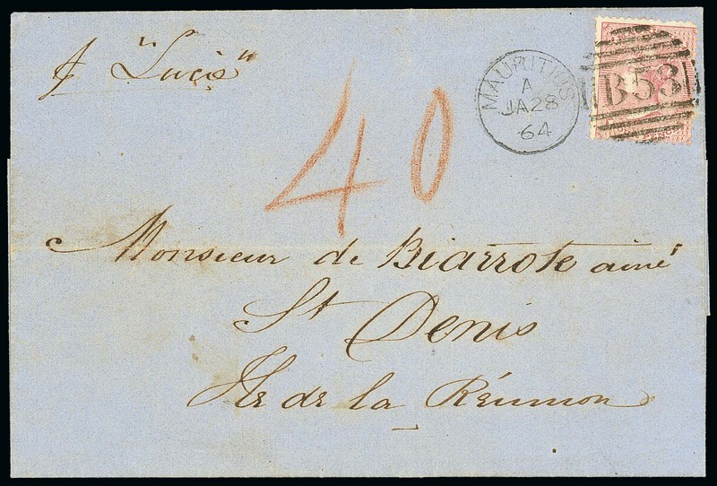 1864 (28 Jan) entire letter from Port Louis to Reunion, marked "p Lucie", bearing 4d. carmine clearly tied by "B53" duplex, showing red crayon "40" alongside and, on reverse, framed "m & i" and arrival datestamp, both in black. Photo