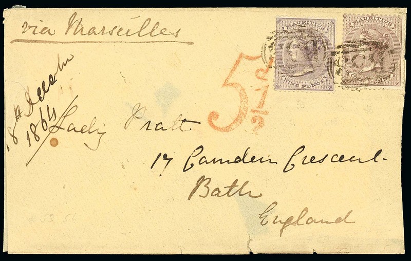 1864 (7 Dec.) envelope to Bath, marked "via Marseilles", bearing 1860 1d. purple-brown and 9d. dull purple, both tied by "B53" obliterator and showing red "5½d" accountancy h.s. (Type A17) with, on reverse, despatch and arrival datestamps; the envelope slightly truncated at left and with a few minor peripheral faults. Photo