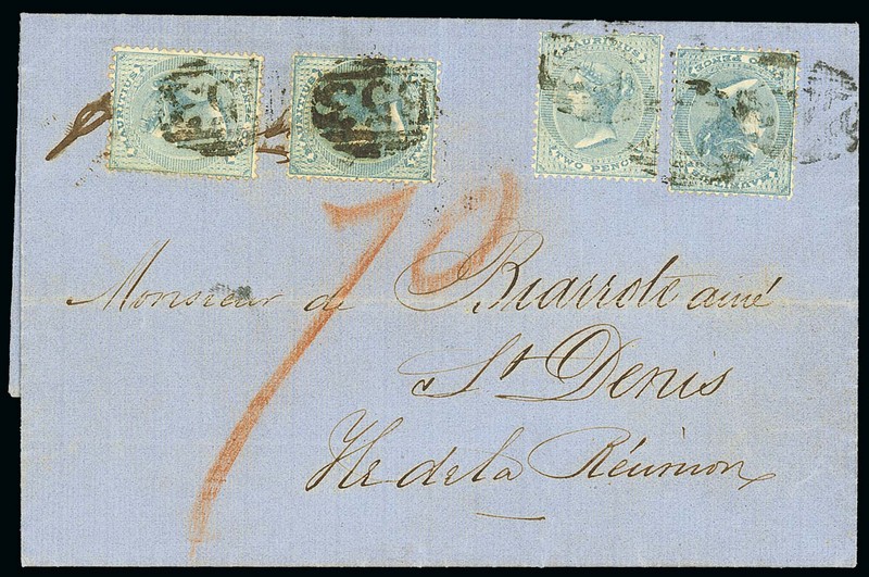 1865 (5 Jan.) double rate entire letter to Reunion, bearing 2d. blue (4) each tied by "B53" obliterator, showing red crayon "70" and, on reverse, framed "m & i" with despatch and arrival datestamps. Photo