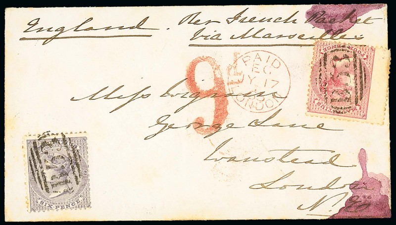 1865 (17 June) envelope to London, marked "per French Packet via Marseilles", bearing 1863-72 4d. rose and 6d. dull violet, both centrally cancelled "B53", showing "9d" accountancy h.s. (Type A21) and arrival c.d.s. (17.7), both in red, alongside with despatch datestamp on reverse; the envelope with contemporary red ink stains at top and bottom left. S.G. 62, 63. Photo