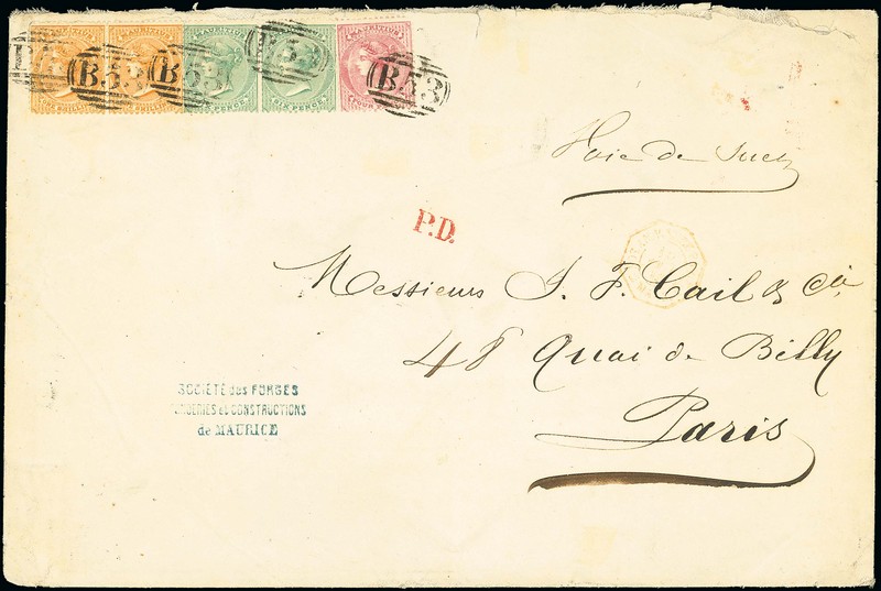 1866 (17 Sept.) treble rate envelope (225x150mm.) envelope to Paris, marked "Voie de Suez", bearing 1863-72 4d. rose, 6d. green pair and 1/- yellow pair tied by "B53" obliterators, showing unframed "p.d." and light "pos. an. v. suez/2 mars.2" octagonal d.s. with clear despatch datestamp on reverse; the envelope a little soiled, nevertheless a scarce and attractive franking. Photo