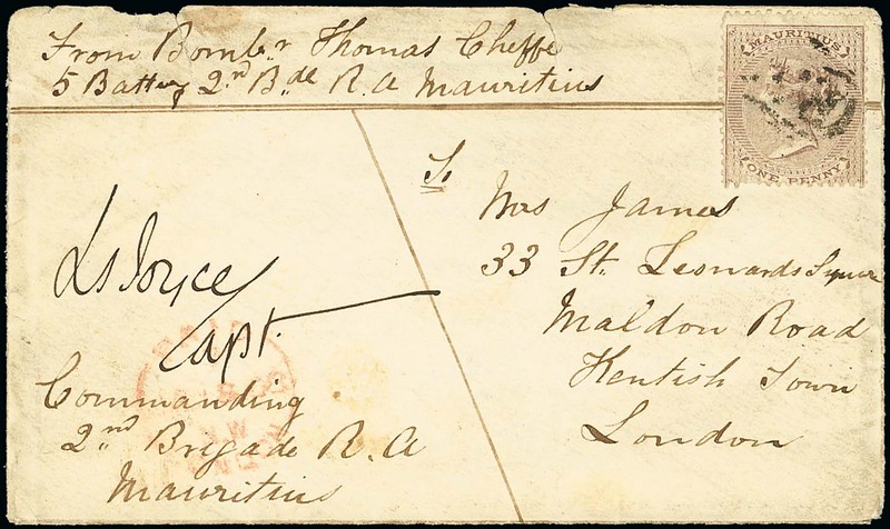 1867 (6 Dec.) soldier's envelope (with letter) to London, headed "From Bombr Thomas Chiffe, 5 Battery 2nd Bde R.A. Mauritius", bearing untied 1863 1d. brown cancelled by poor "B53", countersigned by Commanding Officer and showing red arrival c.d.s. with despatch datestamp on reverse; the envelope a little soiled and with some small faults at top caused through opening. Very scarce. Photo