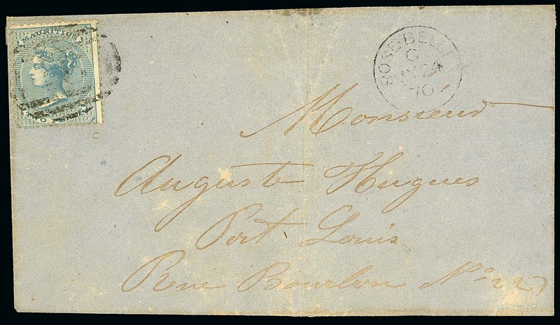 1870 (24 May) entire from Rose Belle to Port Louis, bearing 1863-72 2d. bright blue tied by "16" obliterator, showing light despatch c.d.s. with part arrival c.d.s. on reverse; the entire with top flap missing and with central vertical crease. Photo
