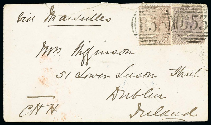 1872 (31 May) envelope to Dublin, marked "Via Marseilles", bearing 1860 9d. dull purple and 1863-72 1d. brown, both clearly tied by "B53" obliterator and showing, on reverse, despatch, H&K Packet and London datestamps; the envelope with tear at top caused through opening. S.G. 51, 57. Photo