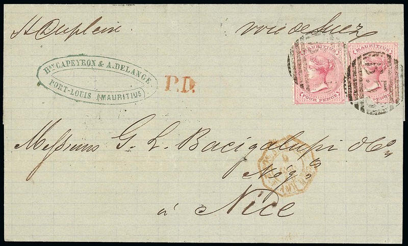 1874 (13 Nov.) entire to Nice, marked "St Dupleix" and "voie de Suez", bearing 4d. rose pair clearly tied by "B53" obliterator, showing unframed "p.d." with, on reverse, despatch and arrival datestamps. Attractive. S.G. 62. Photo