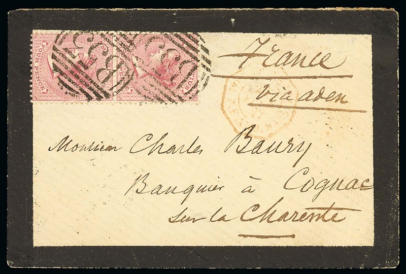 1877 (2 Feb.) mourning envelope to France, marked "via Aden", bearing 1863-72 4d. rose vertical pair clearly tied by "B53" obliterator and showing, on reverse, despatch and arrival datestamps. Neat and attractive. S.G. 62. Photo