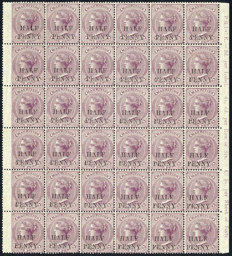 "half/penny" on 9d. dull purple, a marginal block of thirty-six (6x6) with large part or full original gum, fresh and fine; also "half/penny" on 10d. maroon mint block of forty-eight (6x8), a few split perfs, fine. S.G. 76-77, £1020