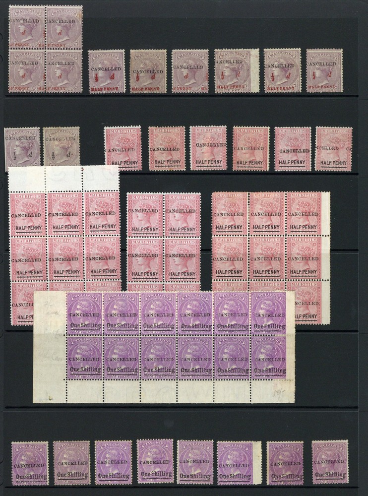 Prepared for use but not issued, ½d. on 9d dull purple block of four with misplaced surcharge and singles (8, one with surcharge misplaced and two with surcharge in black); also 1877 ½d. on 10d. interpanneau block of forty-eight, blocks of thirty, nine (2) and six and singles (6) and 1/- on 5/- block of twelve being the bottom two rows of a pane and singles (15), each overprinted "cancelled", mostly fine. S.G. 78-82