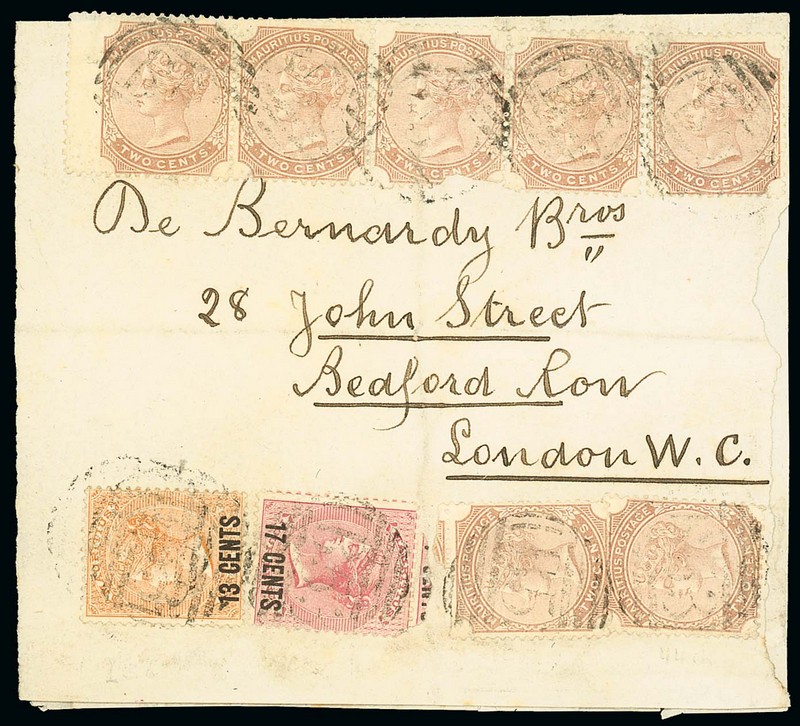 Undated eleven times rate wrapper? ex the "De Bernardy Bros." correspondence to London, bearing 13c. on 3d. orange-red and 17c. on 4d. rose, in combination with 1880 2c. Venetian red strip of five (centre stamp damaged at foot) and singles (2), all tied by light "B53" obliterator; the wrapper with pressed central horizontal and vertical creased. S.G. 86, 87, 92. Photo