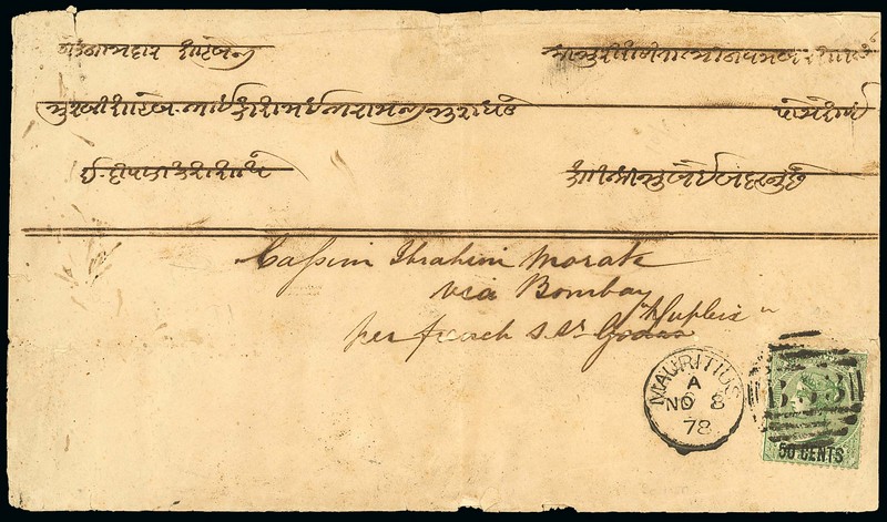 1878 (8 Nov.) envelope to Bombay, bearing 50c. on 1/- green tied by "B53" duplex and showing, on reverse, Sea Post Office and arrival datestamps; the envelope with a few minor faults. S.G. 90. Photo