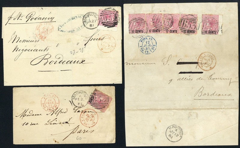 1881 (27 Jan. - 12 July) envelopes (3) and a front and part back addressed to France (3) and India, all bearing 17c. on 4d. rose, two at single rate, one at treble rate and one at five times rate, one shows fine "poss. an./paq. fr. t no 1" octagonal d.s. in red and another shows "poss. an./paq. fr. t no 2" octagonal d.s. in blue; all with faults. S.G. 87